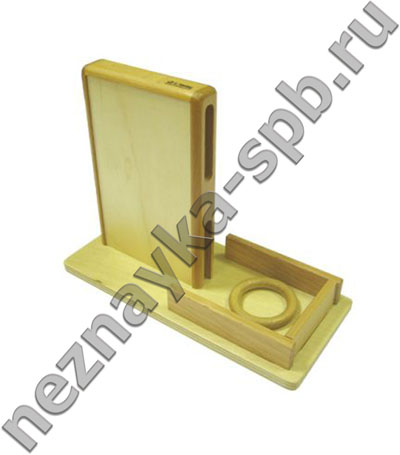Коробочка с двумя прорезями закрепленная на подносе. В комплекте два деревянных колечка.