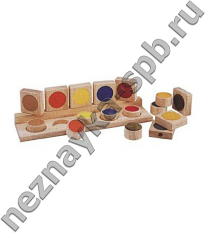 Комплект состоит из деревянной подставки и восьми пар квадрата с цилиндром на разное тактильное ощущение.